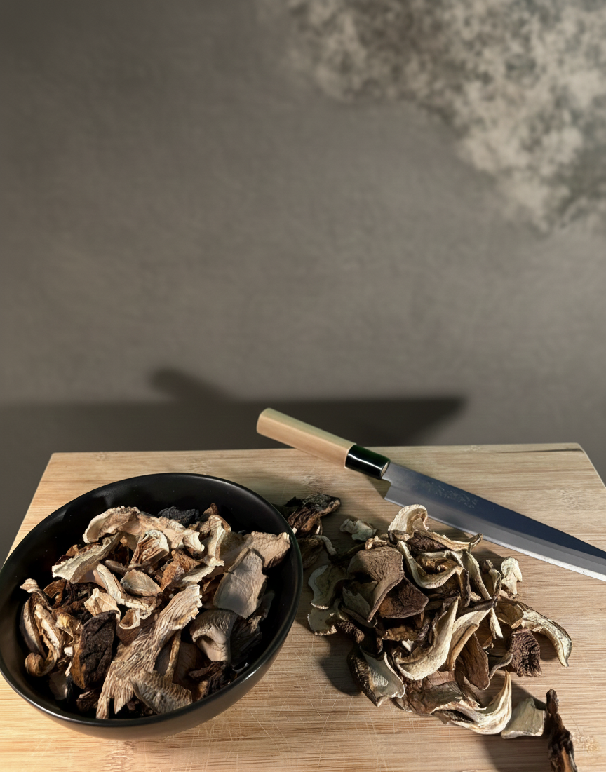 La noblesse du cèpe et la puissance aromatique du shiitaké s’harmonisent avec la douceur des bolets jaunes et le fondant des pleurotes, offrant un contraste subtil entre croquant et moelleux.